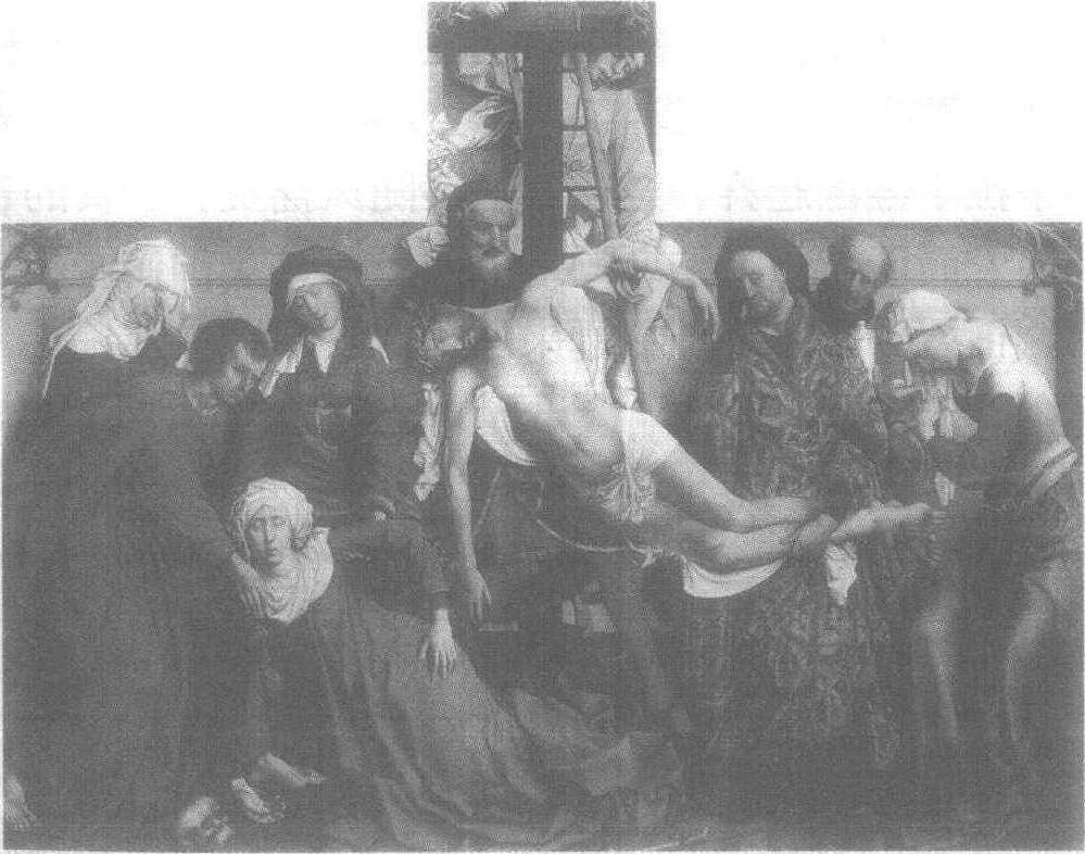 从十字架上放下耶稣 凡 ·代 ·魏登 全画描绘的是基督从十字架上放下来时的情景。构图的骨架很简单,由一些僵立的人物构成一个长方形,两端像括弧一样地被括起。人物脸部的排列能看出沿椭圆形运动,他们的动作和表情充满了悲痛。由于其运动节奏不断被呆滞、弯曲的肘部线条所阻碍,因而更增强了这种悲痛气氛。首先是基督的左腕,其次是圣母的左胳膊肘,最后是马格达娜的双腕。特别是她扭曲的姿势,在整个构图中更让人产生一种痛不欲生的感觉。在这幕戏剧的中央,基督的圣体,仿佛已经失去了重量,犹如一轮新月悬挂在半空中,充满了静穆之美。 关于魏登(约1399—1464)的生平我们几乎一无所知,只知道他在世之日已享有盛名,曾定居在南尼德兰的布鲁塞尔。这幅祭坛画,是根据射手组合的订件,为他们在卢万的教堂画的。制作的年代也不详,很可能是他出师之后所画的最初的成功之作。画中对于形态的关心,显示出从杨 ·凡 ·爱克对光和空气的敏锐知觉,向着纵深的追求的努力。画中所有人物的脸、手、足……均达到了一种理想化的处理。在这 一点上,他虽仍继承了哥特式艺术的传统,但却达到了将个别性格与普遍人性的统一。 我们不妨再来看看圣母的脸部,她的白麻头巾,与马格达娜的两条胳膊同样,中途虽被折曲但并没有失去动势。圣母的左手(每个人都有自己的手,它们不只具有种种的美,而且与身体其他部分保持着一种整体关系。)无力地垂着,但与已经失去生命的基督的右手相比,又是活生生的一只手。她的右手放在骷髅与圣约翰的光脚之间,好像要从大地上提取什么新的生命吧。我们的视线顺着圣母衣裳上升的斜线和圣约翰的胳膊移动,目光停在了圣者们脸上的表情上,开始了前面说过的椭圆形运动。这是不易察觉的,它无疑是超越物质世界的一种精神的把握。 |