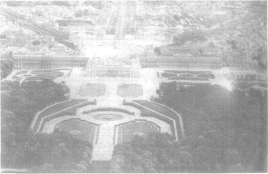 | 释义 | 凡尔赛宫欧洲最大的王宫,位于巴黎西南郊,平面如 “开” 字形,顶部的三合院为路易十四时期所建,1678年—1688年间以三合院为中心扩建了南北翼,宽达402米,形成了现有的规模。南翼为王子和亲王的住处,北翼是政府办公的处所,并有教堂、剧院。东侧广场前是中轴对称的三条放射形大道,使建筑如同巴黎、甚至法国的中心 一样,反映了中央集权和绝对君权的思想。建筑西面为面积达6.7平方公里的大花园,中轴长达3公里,园内道路、树木、水池、亭台、花园喷泉等均呈几何形布局,视觉上有主次轴线和对景,气势非凡,是法国古典园林的杰作。建筑中部西临大花园的国王接见厅,就是著名的镜廊,长73m,宽10m,圆拱顶高13m,厅内白色和紫色大理石墙面,绿色科林斯林大理石壁柱,柱头和柱础皆为铜铸镶金,檐口装饰以金色的花环和天使雕像,拱顶画着9幅国王的史迹画,朝向花园的墙面壁柱间有17扇巨大的拱形落地窗,相对的墙面与落地窗对应镶嵌着17面镜子。装修金碧辉煌,室内外景致相互辉映,充分反映了建筑在综合运用雕塑、绘画、科学技术的手段后在创造美的环境上所达到的成就。