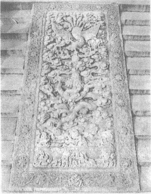 | 释义 | 凤戏龙陛阶御路石清。长3.19米,宽1.6米。河北省遵化县清东陵文物管理处藏。这是慈禧陵隆恩殿前陛阶御路石。白色大理石质。高浮雕而成。中心在祥云、海浪、山石间饰一龙一凤。凤展翅凌空俯首向下,龙腾身海面引体向上,共戏一放射光焰的火珠。其外环以缠连不断的蕃草纹。雕刻精细,纹饰生动华美,极富浪漫色彩,是清末皇家陵墓雕刻的佳作。