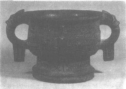 西周。盛食器。高15.6厘米,口径18.4厘米,底径14.7厘米。重2.15公斤。上海博物馆藏。此簋双兽耳,作兽头鸟身形象,下有垂珥为鸟爪和卷尾,高圈足。口沿下饰垂尾鸟纹,腹部饰对称的大凤纹,凤冠作长羽飘动状,圈足为爬行龙纹。西周初,常以凤鸟为饰,但如此华丽的凤鸟纹却甚为少见。