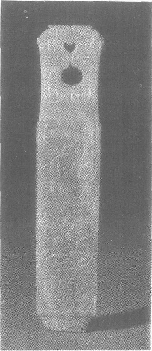 | 释义 | 凤鸟夔纹玉柄形器西周。长17.1厘米,宽3.7厘米,厚0.7厘米。北京故宫博物院藏。此类器物人们多称之为柄形器,最早见于商代墓葬,一直延续至战国中期。其下部有榫结构,定是插入它物的。但其究竟为何种用途,迄今仍无答案。此柄形器为青玉琢制,呈半透明状,外观近于长方形,上部饰相对长尾鸟一对,并利用两鸟相对的身体曲线,镂空两个桃形。中部琢一尖喙、高冠的长尾凤,其利爪紧抓身下的夔龙。此器纹饰流畅精细,阴刻、隐起、单线等几种手法并用,是一件优秀之作。