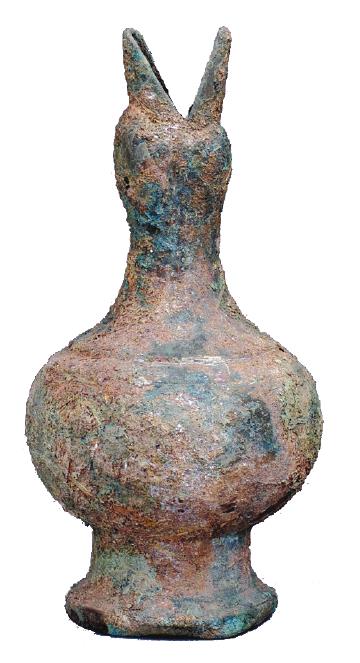 | 释义 | 凫首型铜壶铜器。国家一级文物。亦称鸭嘴壶。共两件。一件于 1996 年 8 月出土于今秦州区周家巷,通高28 厘米,口径 4.8 厘米,重 1.4公斤。造型上,凫口大张,双目圆睁,凫首及颈上刻以精细的羽毛,层层叠压,宛若一只野鸭张嘴朝天鸣叫。另一件于 1997 年出土于天水市区北山皇城一座汉墓内。鼓腹、曲颈、凫首,高 39厘米,底径 23.8 厘米,重 5.2 公斤。壶首为一弯曲的凫首形状,凫紧闭嘴巴,双目圆睁,嘴巴长而下垂,颈部以下铆接一壶。两壶现藏天水市博物馆。