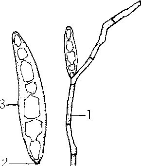 凸脐蠕孢囊 1.分生孢子梗 2.脐点突出 3. 分生孢子 |