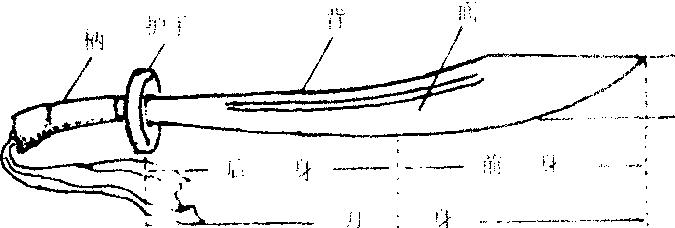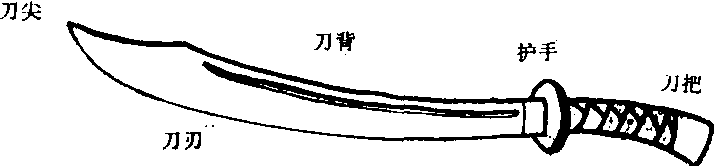 刀的部位名称 刀种砍杀性兵器。各代都作为常备武器之一。种类很多,如朴刀、仪刀、陌刀、拍刀、尖刀、掉刀、手刀、佩刀、欢耳刀、戟刀、腰刀等。 刀宋兵器名。为长柄刀。一面刃,刃前锐,后斜阔,木杆,末端安铁鐏。为宋军常用兵器之一。 刀Dao武术短器械的一种。形状和各部位的名称见图。