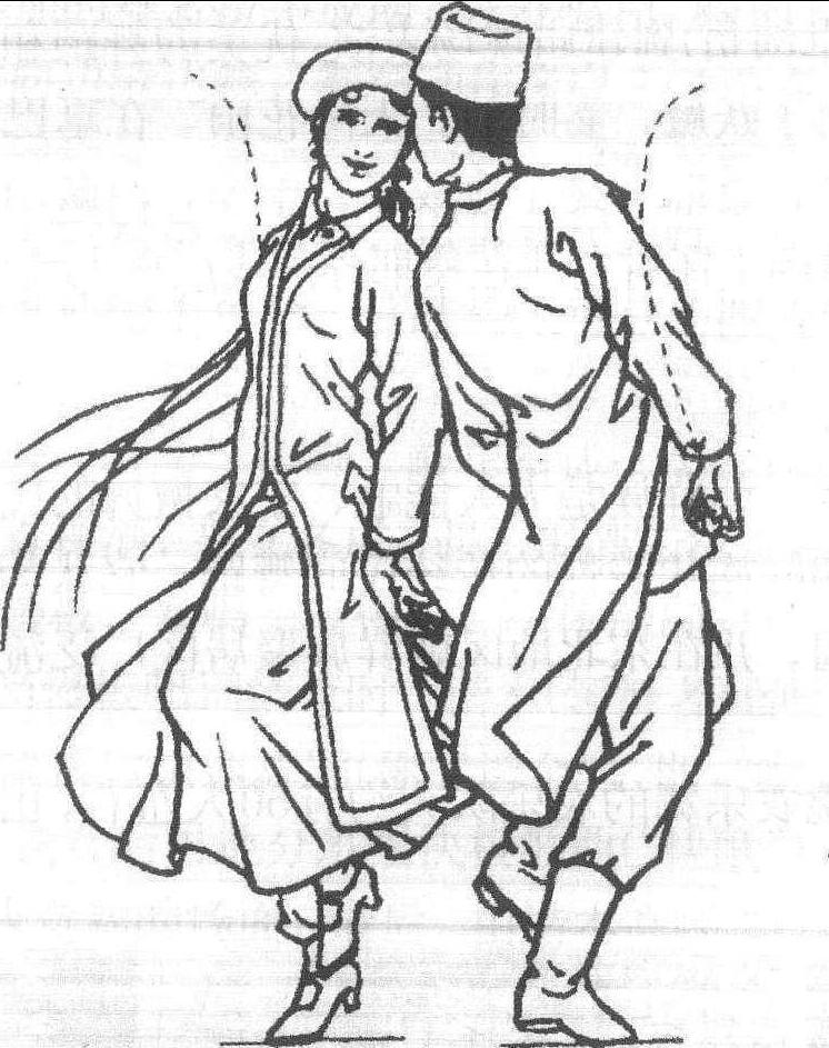 刀朗舞由“刀朗木卡姆”作为伴奏曲。舞蹈动作挺拔舒展,粗犷矫健。主要的舞步是“滑冲步”,主要的表演形式是双人对舞。可以男女对舞,也可以两男或两女对舞。舞者的人数不限,少时只有一组对舞者,多时可达数百对同时上场。参加者必须从开始跳到最后,中途不得退场。多人跳时,开始先是双双对舞,以后所有参舞者逐渐形成一个大圆圈,沿着逆时针方向行进。音乐由慢到快,舞蹈也由平稳转为激烈,对舞成了对转,且越转越快,最后发展成竞技性的个人旋转表演,体力不支者纷纷下场,直至场上只剩下 一个旋转如风的舞蹈能手,在众人的喝彩声中结束表演。 刀朗舞即“刀郎舞”。 |