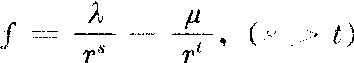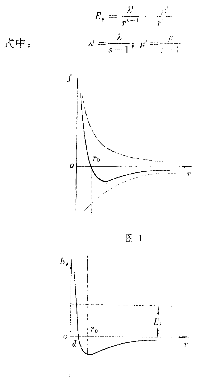 来表示,其中r是两分子中心间的距离,λ、μ、t、s是由实验确定的正数,分子相互作用的曲线如图1,右上方的虚线表示斥力,右下方的虚线表示引力,实线表示合力,在r=r0处合力为零。分子间相互作用的势能为: