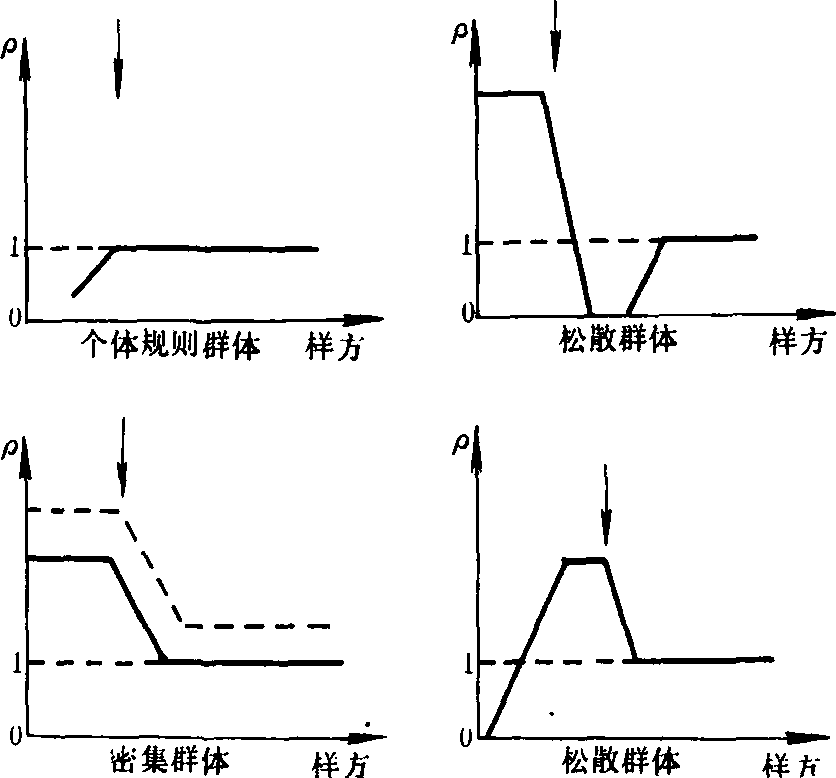 式中 i=1,2,3,………,代表样方由小到大时的顺序号,对最小的样方(i=1),则ρ= /,即相当于上述聚集指数。ρ指数除可用以分析种群空间分布型外,特别可用于估计个体群的面积。以样方单位的大小为横坐标,ρi值为纵坐标作图,根据图形的变化测定个体群的面积。❶当分布的基本成分为个体或为密集的个体群时,ρ<1,样方小于个体群面积; ρ≥1,样方大于个体群面积;❷当分布的基本成分为疏松的个体群时,ρ>1,样方小于个体群面积;ρ值显著下降,样方大于个体群面积。在二者的转折点处(如图上的箭头),所对应的样方单位大小,即可表示个体群的面积(见图)。