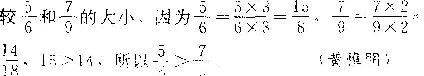 三种情况:❶分母相同的分数; ❷分子相同的分数; ❸分子和分母都不相同的分数。对第三种情况,一般先通分,把它们化为同分母的分数然后再进行比较。例:比 ![]() |