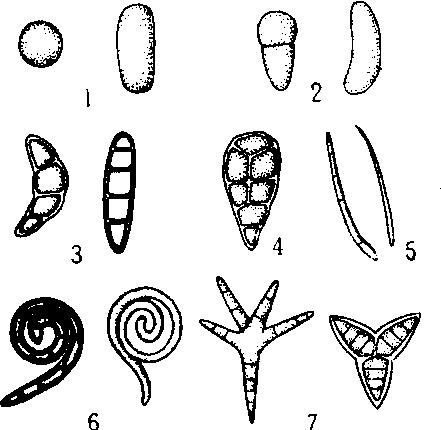 分生孢子形态类型 1.单胞孢子 2. 双胞孢子3. 多胞孢子 4.砖格孢子 5. 线形孢子 6. 螺旋孢子 7.星状孢子 |
