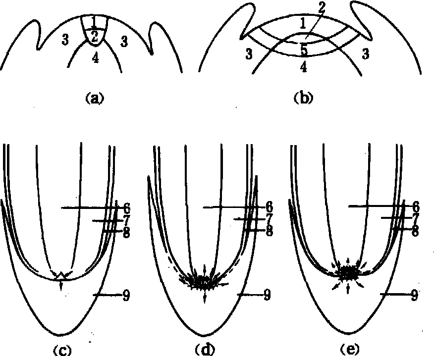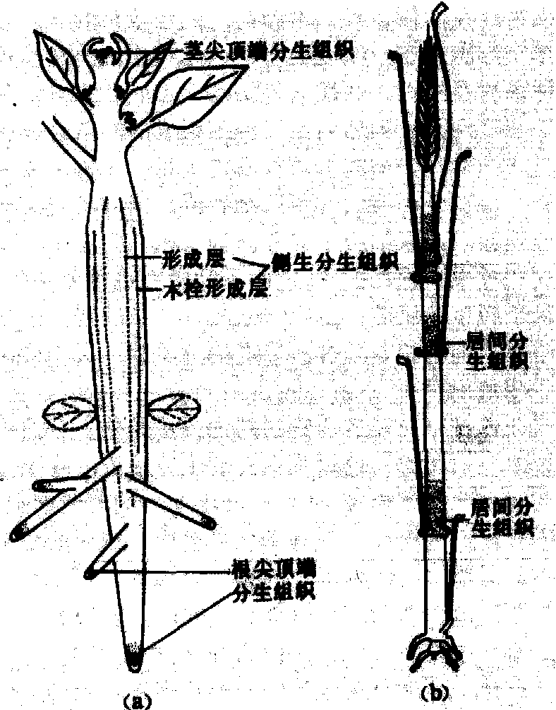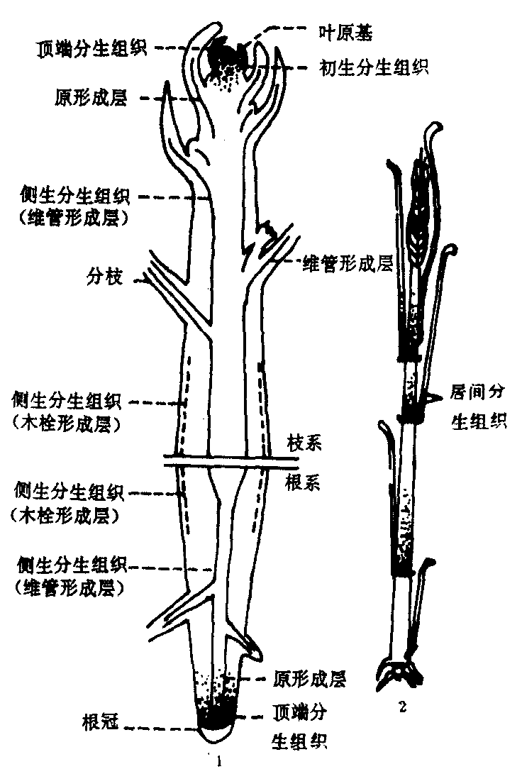 分生组织的细胞学特征 细胞排列紧密,无细胞间隙,通常细胞壁薄,由果胶质、纤维素构成,细胞核较大,细胞质丰富,具有较多的细胞器和发达的膜系统。除木栓形成层外,通常缺乏贮藏物质和结晶体,质体处于前质体阶段。顶端分生组织细胞只有一些极小的液泡,但裸子植物和其他维管植物的顶端分生组织细胞中,液泡比较明显。形成层细胞高度液泡化。分生组织细胞的渗透势较低,物质代谢活跃,偏向于新原生质的合成,有旺盛的分裂能力。 分生组织的类型 根据分生组织的发源性质,可分为原分生组织、初生分生组织和次生分生组织3类。 原分生组织 来源于胚或植物体生长部位中未分化的胚性原始细胞。有持续分裂的能力,存在于根尖和茎尖的最先端,是产生其他组织的发源处。 初生分生组织 由原分生组织衍生而来。它们虽已初步分化,但仍有很强的分裂能力,可视为分生组织到成熟组织之间的过渡性组织。根尖、茎尖中的稍后部位的原表皮,原形成层和基本分生组织属此。 次生分生组织 由某些成熟组织经过脱分化、重新恢复细胞分裂机能而来,可自表皮、皮层、中柱鞘、韧皮部中发生。束间形成层和木栓形成层是典型的次生分生组织。 根据分生组织在植物体中的分布位置不同,又可分为顶端分生组织、侧生分生组织和居间分生组织3类。 顶端分生组织 存在于根尖和茎尖的分生区,若结合组织发生和性质分析,顶端分生组织相当于原分生组织,有人认为包括原分生组织和初生分生组织。真蕨、木贼和其他一些维管植物,其根尖和茎尖的最前端只有一个呈四面体形的原始细胞,其他组织均由此细胞分裂衍生而来。种子植物根尖、茎尖的最前端为一群原始细胞组成,衍生新细胞的情况比较复杂(图2)。