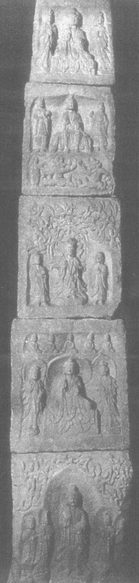 | 释义 | 分石雕刻造像塔北魏。通高218厘米,底宽44厘米,厚44厘米。甘肃省庄浪县出土,甘肃省博物馆藏。塔计五层,分石雕制后重叠而成,呈阶梯状自下而上依次递减。每层三面造像。正面龛内皆以佛为本尊,其或站或坐,呈不同姿态,佛两旁自上而下,每层分别雕以胁侍菩萨、弟子、天王。龛上方和下方刻以怪兽、飞天、小坐佛等。塔左、右两侧刻佛本生和经变等故事。