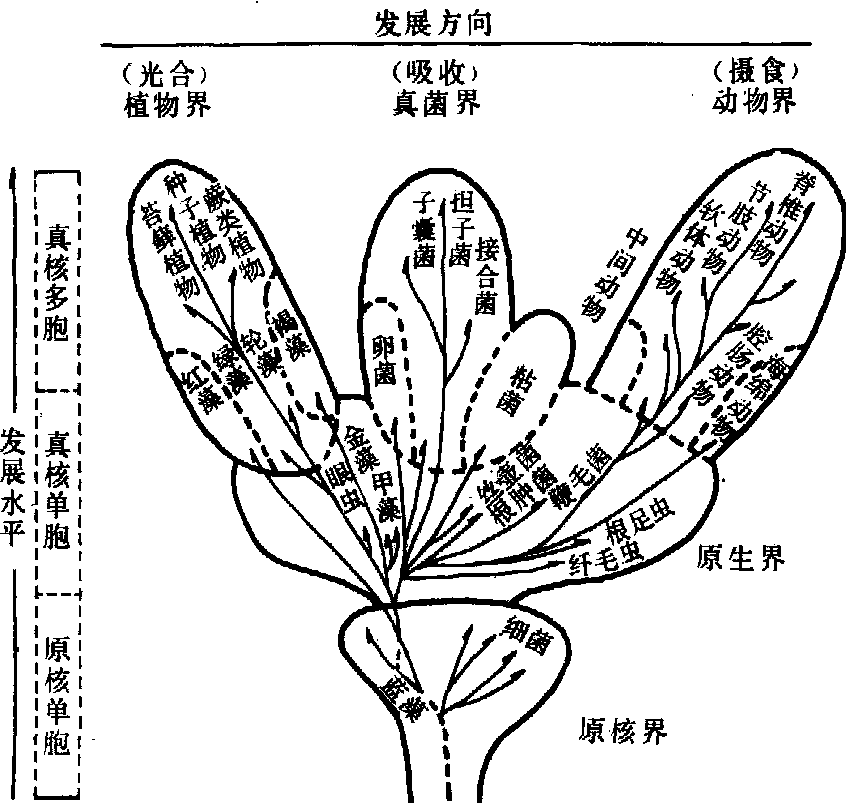 随着科学的进展,两界系统的应用不断发生困难。诸如真菌不营光合作用,只因固着生活及细胞有壁,而被归属于植物界; 更突出的是眼虫,它综合了动植物两界的双重性状。1866年,德国著名生物学家海克尔(E.H.Haeckel,1834~1919) 从进化的观点提出原生生物界(protista),包括单细胞动物和其它一些不能明确属于动物界或植物界的单细胞生物,作为动物界和植物界的起源。这个三界分类法,初步反映了生物的进化系统。20世纪以来对真菌开展的研究,从它们不含叶绿素,不能进行光合作用而营腐生或寄生生活,加之细胞壁的化学组成缺乏纤维素而由几丁质或其它多糖类为主要成分,与植物缺少亲缘关系,惠特克(R. H.Whittaker)于1959年提出另立为真菌界。在广泛开展的微生物学研究中,识别了各种微生物的细胞结构有两大类型,即细菌类的原核细胞型和原生动物类与酵母类的真核细胞型,它们在进化程度上有很大距离。细菌类归在植物界显然不合理,也不能属于原生生物界。斯塔尼尔(R.Y.Stanier)和范尼尔于1964年称细菌类为原核生物,区别于真核生物,默里(Murray)于1986年立为原核生物界。惠特克又于1969年提出生物的五界分类系统,即: 原核界、原生界、植物界、真菌界和动物界 (见图)。以原核生物界为真核生物进化的前阶段,原生生物界是真核生物的初级类型。表示了地球上细胞生物的进化历程。这个五界分类系统现已被普遍接受。