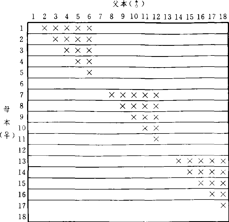 分组不连续的交配设计法(每个“×”表示所要做的交配组合) |