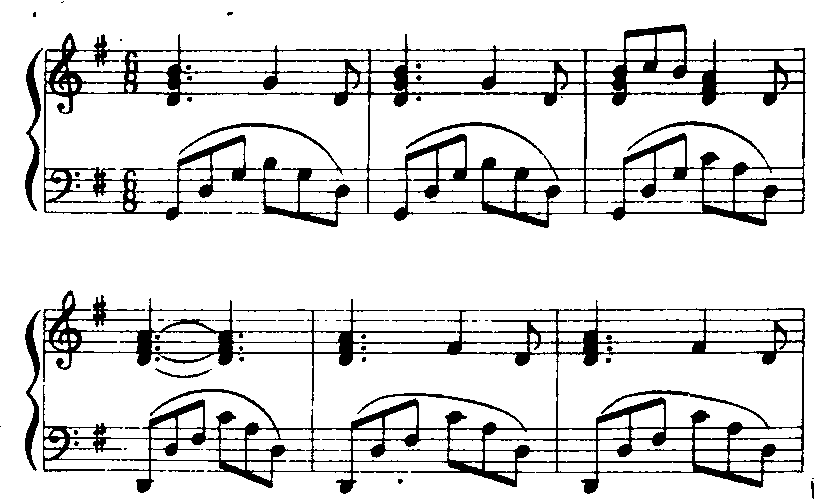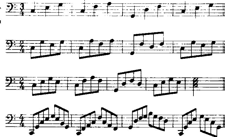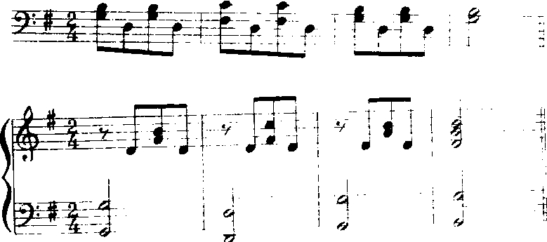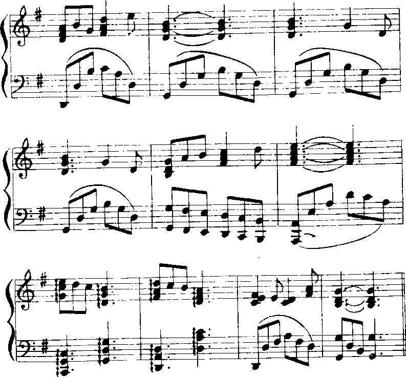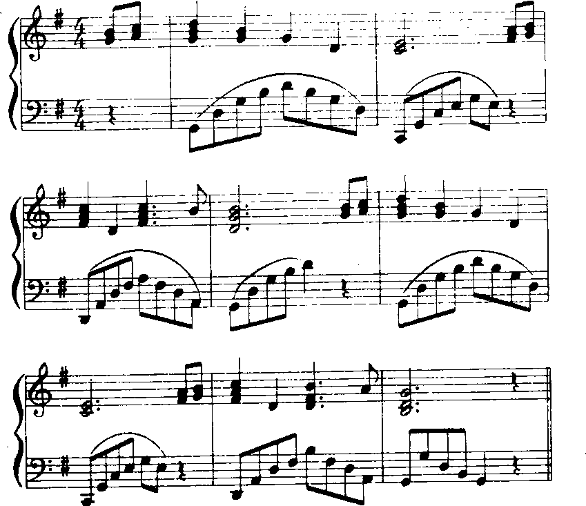 这种节奏型适用于抒情性,柔美的歌曲或乐曲的伴奏,当然有时也可以用于表现轻快型的歌曲伴奏。分解和弦式伴奏音型也是多种多样,变化十分丰富的一种音型,常用的有以下数种:(1)单琶音式分解和弦伴奏音型,如左手单手练习: