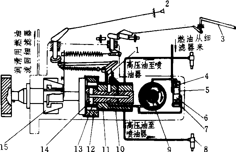 分配泵工作原理图 1. 油量控制阀 2.停油按钮 3. 油门杆 4. 限压弹簧 5. 滑柱 6. 限压阀 7. 预供弹簧 8. 喷油器 9. 输油泵 10. 分配套筒 11. 分配转子 12. 内凸轮 13. 滚柱 14. 柱塞 15.调速器离心块 |