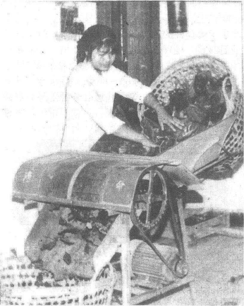 切桑叶是养蚕过程中比较繁重的工作,过去一直用切桑刀切叶,劳动强度大。中国从1949年开始研究,其结构采用滚刀式,滚刀横刀式、“T”、“∧”形刀式三种,送叶形式有间歇送叶和连续送叶两种,有电动的也有手摇的。现在生产上使用的有多种型式,其中使用较多的为YM400-71型切桑机。本机由电动机、机架、侧板、送叶辊筒、变速传动机构、横刀(双螺旋刀)、圆刀组(共5组)、叶篓架及防护罩等组成。该机运转时,由木辊筒连续送叶,摆杆塔轮变速、圆刀、麻花刀切叶,切桑幅度为400毫米。外形尺寸为1 004×760×1 140毫米。切出叶片长度有: 8~9、12~13、25~26,38~39及55~56毫米等5种,宽度有13、26、39、52及65毫米等5种。长宽组合可有22种,但一般只用13×13、26×26、39×39、56×56毫米几种近于正方形的切桑尺寸。条叶可用9×13、9×26、9×39……毫米等多种。切桑效率根据所切桑叶尺寸而不同,每台每人每小时切桑量为240~1,666千克,比手工切叶提高10倍以上。该机一般用于2龄起至5龄饷食期切桑,每台机器所切桑叶量,约可供应饲养2 500克蚕(蚁量)的食桑用叶。