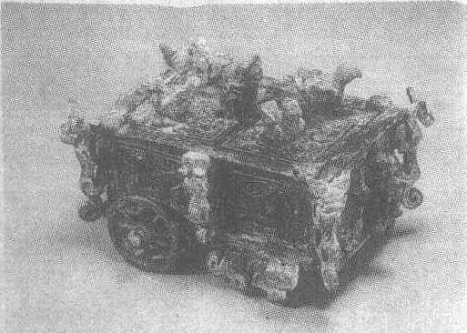 | 释义 | 刖人守囿铜挽车西周。通高9.1厘米,长13.7厘米,宽11.3厘米。山西省闻喜县上郭村出土。山西省考古研究所藏。挽车体呈长方形,既可牵动,又可推动,其中的四个小轮为虎踏车轮。两扇车门可开闭,其中一扇门上嵌一守门刖人,其腋下的门栓可控制车门的开闭。车箱盖亦可开合,拉手作成猴子形,四周立有四只可转动的小鸟,旋转灵活,可用于测风。车身满铸各种花纹,在底纹图案的衬托下,镶嵌着立体动物14个,表现的是畜养禽兽的“囿”。这件挽车的出土,映证了《周礼》记载的“刖者守囿”。刖人是指受了刖刑(锯掉人的脚)的人。整件挽车铸造精湛,能活动的部位多达15处,把苑囿场面与铜挽车结合在一起,表明了那个时代工匠的奇特构思,为研究我国奴隶社会的历史提供了十分珍贵的实物资料。