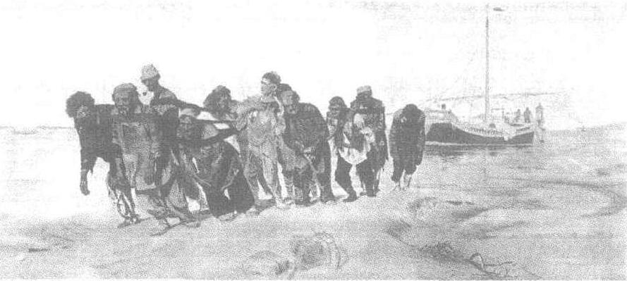 | 释义 | 列宾《伏尔加纤夫》烈日当空,在辽阔的伏尔加河畔,一群衣衫褴褛的纤夫拉着帆船,从荒凉的沙滩上缓缓走来。从他们沉重的步伐中,似乎可以听到压抑而低沉的 “伏尔加船夫曲” 的回声: