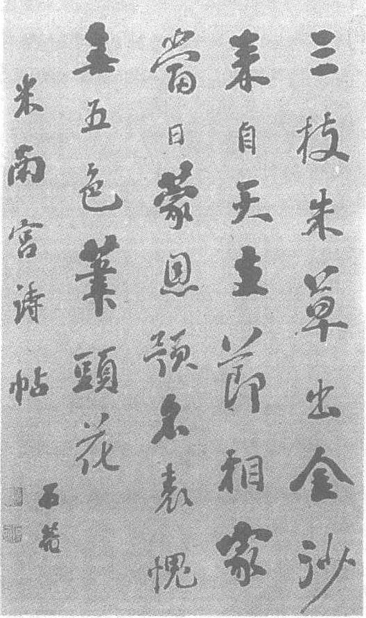 | 释义 | 刘墉行书临米芾诗帖清。纸本。纵80.1厘米,横46.7厘米。上海博物馆藏。刘墉(见《刘墉行书轴》条目)书。此幅行书是刘墉录米芾七言绝句:“三枝朱草出金沙,来自天支节相家,当日蒙恩预名表,愧无五色笔头花。”款署:“米南宫诗帖,石庵。”款下钤朱文<刘墉印信>、白文<石庵>两印,起首钤朱文:<御赐仙舫>椭圆印。行书墨色厚重,枯润相映,笔画粗壮与纤细巧妙结合,拙中暗含姿媚,结字秀丽,貌丰骨劲的笔致,给人以一种从容大度、端庄精妙的感觉。通观全书,字与字之间虽无一笔相连,然气脉贯通,给人以清新典雅之感。