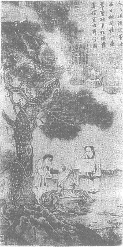 | 释义 | 刘松年醉僧图轴南宋。刘松年(见《刘松年四景山水图卷》条目)绘。绢本设色。纵95.8厘米,横74.8厘米。北京故宫博物院藏。此图绘山野之间,怪石峥嵘,一株苍郁的古松扭曲盘旋而上,老干粗劲,枝杈虬转,松针繁密茂盛。浓荫下,一位酣醉的山僧坐在青石之上,左手撑地,右手则在信笔挥毫。两名青衣小童,一个执绢帛,一个捧墨砚,侍立在醉僧身旁。远处峰崖巉绝,峦岭竞秀。画面通过山僧的狂醉之态,出色地表现了醉僧舒放旷达的个性特征,它也是作者本人钟情山水,欲求心灵与自然合而为一的思想写照。画面构图严谨,笔法工致,用墨灵活,设色轻浅。人物以铁线描作细笔勾勒,山石松干运笔潇洒,墨色浓厚。松针细挺,棘草清劲。远山以淡墨烘染,虚实明暗变幻不定,如在迷雾之中。画幅右上角有诗题曰:“人人送酒不曾沾,每日松间挂一壶,草圣欲来便发狂,真堪画作醉僧图。”坡石间款书:“嘉定庚午刘松年画。”可知此图作于嘉定三年,公元1210年。