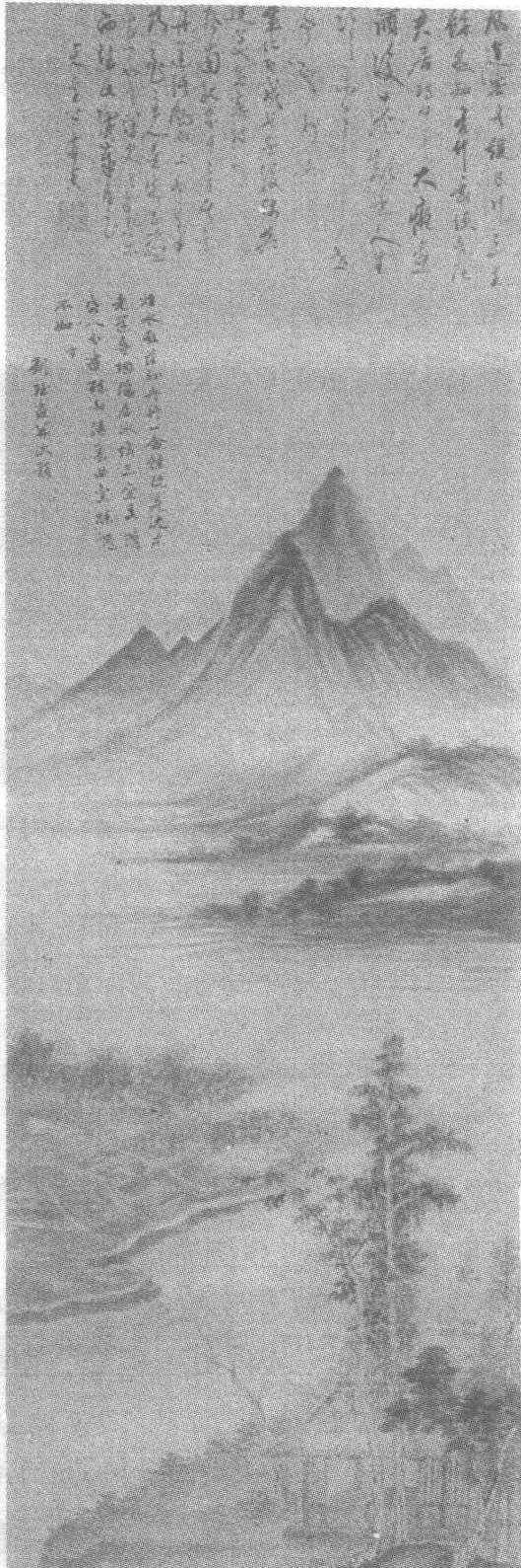 | 释义 | 刘珏烟水微茫图轴明。刘珏(见《刘珏清百轩图轴》条目)绘。纸本墨笔。纵139.4厘米,横44厘米。江苏省苏州博物馆藏。此图描绘明代著名画家沈周的别墅“有竹居”及其附近的秀丽风光。据作者跋文所记,丙戌成化二年(公元1466年)长至后,画家与吴中名士徐有贞一同去吴县湘城拜访沈周,在“有竹居”,沈周“喜客甚,尽出家有图史与观。”作者乃乘兴即日绘成此图留赠主人。图中山岭绵连交叠,浑劲峭拔。幽谷间回荡着烟岚水雾,峰头冈下,树影朦胧。湖水漫漫,平旷宽展。中景是齐整的农田,阡陌纵横,秧苗如茵。田垅的边缘密植桑麻。近岸坡头,蕙草丛生,一架草屋座落在树荫深处,清静幽寂,画意恬淡。此图布局取法倪瓒,笔墨技法仿效吴镇,丛树草屋皆以中锋直笔勾描,墨色润淡。峰峦坡冈用披麻皴染,水墨华滋,自然纯熟。图中作者题诗一首:“烟水微茫外,舟行一舍余,既觅沈东老,还寻陶隐居。冰弦三叠弄,茧习八分书。醉和阳春曲,空疏愧不如。”徐有贞亦赋诗于画幅上端。图右下角钤<有竹庄>、<沈周审玩>两方鉴藏印章。