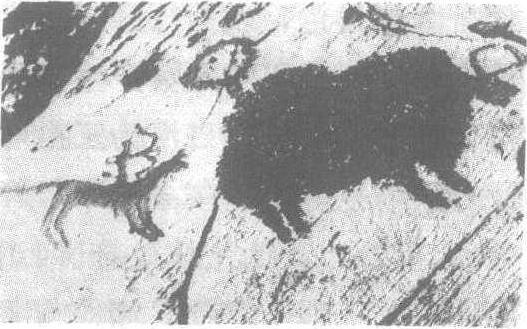 | 释义 | 刚察岩画骑射牦牛图青铜时代。崖壁凿刻。纵35厘米,横40厘米。刚察岩画位于青海省海北蒙古族自治州刚察县泉吉乡黑山舍布棋沟北端入口处一崖壁顶部。刻有许多的动物形象,凿刻方法变化多样,从痕迹上看,可能运用了金属工具。表现出的动物形象有一定的质感,很有特色。本图是其中的一幅精彩之作。图中一头肥大的牦牛正被一个骑马的猎人追射,它头向前伸,尾巴高高翘起,正在奔逃。但它头小,腿短而身躯庞大,显得十分蠢笨。从其张嘴嚎叫的姿态看,可能已经中了几箭。它身后是一匹飞驰的骏马,马也伸着脖子,从其平直飘动的长尾看,速度显然快得多。猎手稳坐其上,搭弓欲射,他那娴熟干练的神态非常传神。从图中可以看出,作者在构思过程中,经过一番提炼加工,牦牛被刻画得体大如墙,而坐骑则被描绘得轻捷似犬。这种通过主观愿望而造成的艺术夸张,在此幅作品中表现得非常突出,对绘画美学的研究很有参考价值。作者还通过密集成片的击斫手法成功地表现了牛身毛质厚重、浓密的特点,这种刻画技法的创新意义深远。