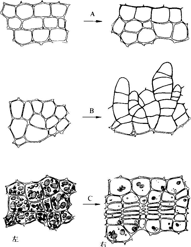 组织受伤后细胞膜的去极化及离子泵改变所造成的势能是重要的胞间信号交流的机制。其传导速率高达3~5厘米/分钟,因而是系统性远距离创伤反应的信号。 细胞膜的变化 植物受伤后几秒钟内,细胞膜的结构和功能发生显著的瞬时改变,使细胞丧失分室效应,正常情况下相互隔离的底物与酶得以混合,液泡内物质外渗,引致一系列次生反应。膜脂迅速发生脱酰基作用,产生脂肪酸供创伤呼吸或氧化成乙烷、乙烯、羟基化合物等。质膜在细胞创伤后首先是去极化,但30分钟内膜势又恢复到-80~-120mV。膜的透性显著改变,离子泵紊乱,与膜有关的酶如胼胝体合成酶及与壁有关的多糖的活性改变。 细胞质的变化 细胞膜破坏导致酶与底物混合及质膜与壁的不正常变化而引起的一系列反应均在细胞质中进行。主要包括蛋白酶抑制剂、病程相关蛋白质(如几丁质酶、β-1,3-葡聚糖酶)、植物保卫素合成有关酶(如苯丙氨酸解氨酶)以及酚酶等的变化。其中最重要的是酚类物质和异戊二烯类次生代谢产物的生物合成。植物受伤后,在创伤组织与健康组织边界的酚类物质含量上升,酚类物质氧化酶类(过氧化物酶、酪氨酸酶和虫漆酶)活性也显著增强,由酚氧化成更毒的醌以及酚游离基构成抗病原物的环境。马铃薯块在受伤的前24小时内,苯丙烷类生物合成的中心酶、苯丙氨酸解氨酶(PAL)、肉桂酸4-羟化酶和ρ-香豆酸辅酶A连接酶显著增加,几小时后绿原酸含量上升,芳香族氨基酸前体合成必需的变位酶也上升。此外,薯块受伤后,异戊二烯生物合成的关键酶3-羟基-3-甲基戊二烯(HMG)辅酶A还原酶活性显著上升,并可迅速积累甾族化合物糖基生物碱(SGA),这些毒性三萜是马铃薯对昆虫和病害抗性的一般机制。甘薯受伤或甘薯黑斑病菌侵染后也有HMG-CoA还原酶活性上升和呋喃萜烯的积累。有些植物受伤后木质化作用增强,植物保卫素合成被启动。例如大豆下胚轴受伤后合成大豆素Ⅰ (glyceollin Ⅰ),一些木本植物受伤后产生单萜,对随后病菌的侵染产生抗性。 番茄和马铃薯叶片受机械损伤或甲虫为害后在整个地上部产生蛋白酶抑制剂Ⅰ和Ⅱ。它们是小分子蛋白质,在薯块中有较高浓度(2%~5%),蛋白酶抑制剂Ⅰ和蛋白酶抑制剂Ⅱ是丝氨酸肽链内切酶(胰凝乳蛋白酶)的有效抑制剂,蛋白酶抑制剂Ⅱ还是胰蛋白酶及胰蛋白酶E的有效抑制剂,它们也都是动物和微生物主要消化酶、金属羧肽酶(如羧肽酶A和羧肽酶B)的有效抑制剂。 植物组织受伤或被侵染后细胞质中有大量的病程相关蛋白积累,研究最广的是水解酶类如几丁质酶和β-1,3-葡聚糖酶(见病程相关蛋白)。 细胞壁的变化 主要是木质素和其它不溶性酚类物质及富含羟脯氨酸糖蛋白向细胞壁的沉积。在植物中这一反应与植物对微生物侵染的抗性有关。用PAL酶的竞争性抑制剂氨基羟乙酸处理马铃薯块组织,木质素积累量降低,组织对瓜枝孢变得敏感。细胞壁中多聚氧化型绿原酸和脂化的ρ-香豆酸及阿魏酸在植物对病原物的抗性中也有作用。软木脂是1种复杂的异质性多聚体,由脂族化合物共价结合到酚骨架上形成,其性质类似木质素。伸展素是1种结构蛋白,属富含羟脯氨酸的糖蛋白,其重要特征之一是在细胞壁中的不溶性,因而可能是植物受伤后形成的结构屏障的重要组分。细胞受伤后上述多聚体物质对细胞壁的修饰使得细胞对病菌侵染产生抗性。其原因是: ❶细胞壁变得能抗多糖酶的降解; ❷修饰后的细胞壁能有效地阻止营养物质向细胞外扩散从而饥饿病菌; ❸阻止了病菌酶、毒素及其它致病因子与健康细胞的接触; ❹使得植物保卫素和其它抗生物素不致扩散,从而在侵染点处积累到较高的浓度; ❺在木质素生物合成过程中,其酚类前体分子,尤其是聚合过程中肉桂基醛类和自由基及侵染过程中从多聚体释放的类似物质具有抗菌活性。 分子遗传基础 细胞创伤后,DNA依赖的RNA聚合酶Ⅰ 和RNA聚合酶Ⅱ (分别负责rRNA和mRNA的合成)被激活,例如马铃薯块受伤18小时后RNA聚合酶Ⅰ活性提高4倍,RNA聚合酶Ⅱ增加2倍,从受伤组织中分离出的染色质在体外合成的RNA的碱基组成与健康组织完全不同,证明增加的RNA聚合酶读出的是一系列新的基因的作用。受伤后基因的激活有2种情况,一是本来处于活化状态的基因在受伤后的转录速率加快; 二是本来关闭的基因受伤后启动转录。受伤细胞中RNA的合成分为2个时期: ❶头2~3小时内,mRNA合成显著,rRNA和tRNA合成相当少,新合成的mRNA迅速与核糖体结合,形成多聚核糖体; ❷第3~6小时,rRNA逐渐增多,首先转录出约2.3×106D的前体分子,并迅速裂解成1.4×106D和0.9×106D的2个组分,然后分别加工成1.3×106D和0.7×106D的RNA分子,即核糖体25S和18S的两个亚单位。 除DNA依赖的RNA聚合酶外,细胞受伤后一系列染色体酶,如DNA依赖的DNA聚合酶、多聚A聚合酶、多聚C聚合酶、蛋白质磷酸激酶,DNA酶、RNA酶、蛋白质激酶等均被激活。成熟的马铃薯块受伤后,组蛋白和非组蛋白染色体蛋白(NHCP)均增加。健康的组织中用SDS凝胶电泳可区分出40种NHCP,其分子量从不足10×1000到大于100×1000,受伤后高分子量的NHCP组分发生显著变化,有的消失(如20,000D和58×1000的蛋白),有的出现(如72,000D和85×1000的蛋白)。 受伤后新形成的核糖体大量地吸附到内质网上,受伤细胞中特征性地形成粗糙型内质网(RER)上,合成的蛋白质从RER上直接释放进细胞质中,用于新膜、细胞壁、核糖体、质体