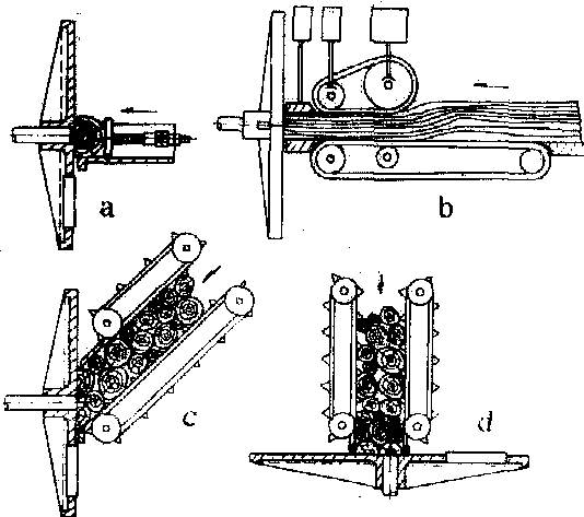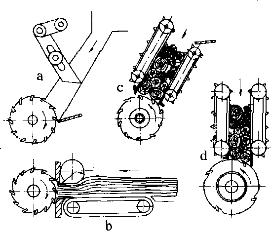 图1 盘式刨片机 鼓式刨片机 因其切削部分形如鼓状而得名。它可以分为轴型鼓式刨片机和筒型鼓式刨片机两类。 ❶轴型鼓式刨片机(图2)。它由切削刀鼓和进料机构组成。在刀鼓的表面开有轴向装刀槽12个,在每条装刀槽的前部又开有排料槽。装刀槽上安装飞刀。飞刀为梳齿形。刀齿宽为26毫米,刀齿槽宽为24毫米。相邻飞刀的齿形要求错开配置。在排料槽中安装支承块,起限位的作用。轴型鼓式刨片机进料部分由料槽、进料机构和底刀组成。进料机构强制原料从料槽进入被切削状态,它可以由电机或液压装置来传