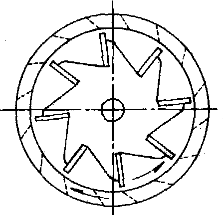 图2 轴型鼓式刨片机 ❷筒型鼓式刨片机(图3): 又称双鼓轮刨片机。它由叶轮、刀轮、进料装置等组成。刀轮的刀环上装有26把飞刀,刀刃口朝向轴心。叶轮形如风机的叶轮,在叶板边缘装有底刀,它一边把待切削的原料吸入,同时在离心力的作用下将这些原料抛出在刀轮飞刀和叶轮底刀的作用下切削成刨片。叶轮和刀轮作相对旋转,刨出刨花由机座的底部出料口排出。