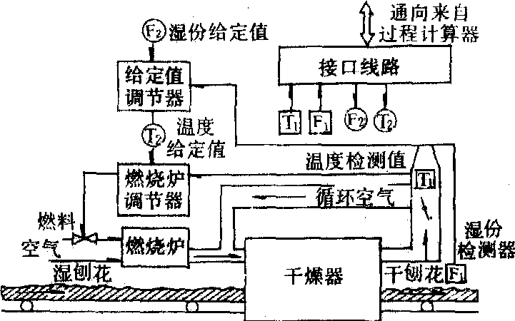 量。通行的调节技术为多级调节(图5)。内部回路主要调节燃烧炉的燃料进料量,它是根据废气出口温度的设定值来调节的。外部回路是通过定值调节以调节刨花含水率,也可以改变刨花在干燥机内滞留时间以调节刨花含水率。通过测量湿刨花含水率也可得到温度应当值。控制器可以用计算机,也可以用调节仪表。