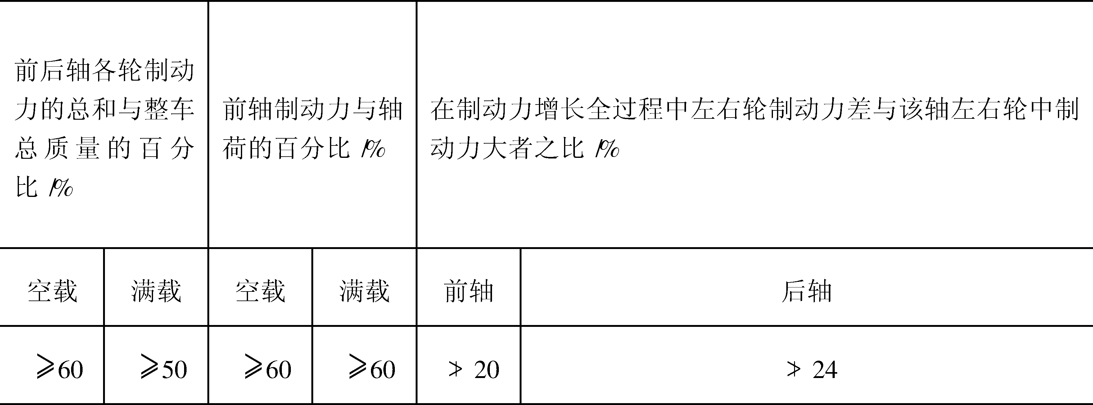 | 释义 | 制动力braking force汽车在行驶过程中由于驾驶员操作制动系统而使汽车产生减速度的力。评价汽车制动性的一项基本指标。当踩踏制动踏板时,车轮制动器的摩擦件与旋转车轮间因接触而产生摩擦力矩,其方向与车轮的旋转方向相反,致使车轮减速而对地面作用一个推地面向前的力,称为制动器制动力。同时,地面对车轮作用一个大小相等、方向相反的反作用力,称为地面制动力,推汽车向后,使汽车产生减速度。地面制动力随着制动器制动力的增大而增大,但地面制动力的最大值受到车轮与路面间附着力F附的约束。F附与车轮所承受的垂直载荷G轮及车轮与路面间的附着系数φ有关:F附=φG轮。当地面制动力的值超过F附值时,则车轮不能继续旋转,出现“车轮抱死”现象,即车轮不再沿路面滚动而是沿路面滑动。理论分析及实验证明,“车轮抱死”使车轮与路面之间由滚动摩擦变为滑动摩擦,车轮几乎全部丧失承受侧向力的能力。此时汽车在侧向力的干扰下易发生侧滑、甩尾等导致交通事故的危险现象。中国国家标准GB7258—1997规定汽车在制动试验台上检测制动力时的制动力要求见下表。 台试检验车轮制动力要求