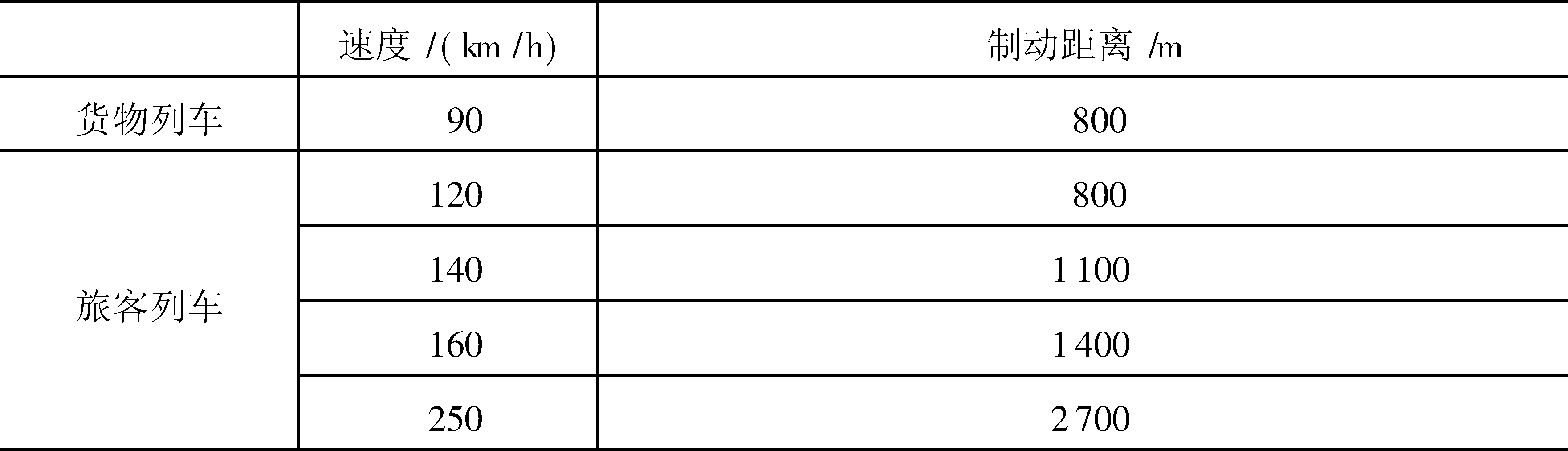 制动距离stopping distance从司机操纵制动阀施行制动的瞬间开始,至列车停止时为止,列车所行驶的距离。制动的性能指标之一。根据《铁路主要技术政策》,按不同情况列车紧急制动距离分别不超过下表所列: