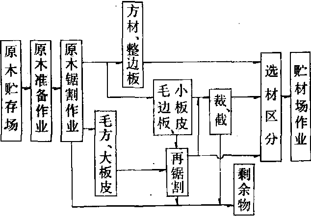 图5 带锯、框锯配合的制材工艺程序 制成毛方后由框锯完成主产品加工。板皮送到卧式带锯机锯割成毛边板,再经双圆锯裁边机裁边。 |