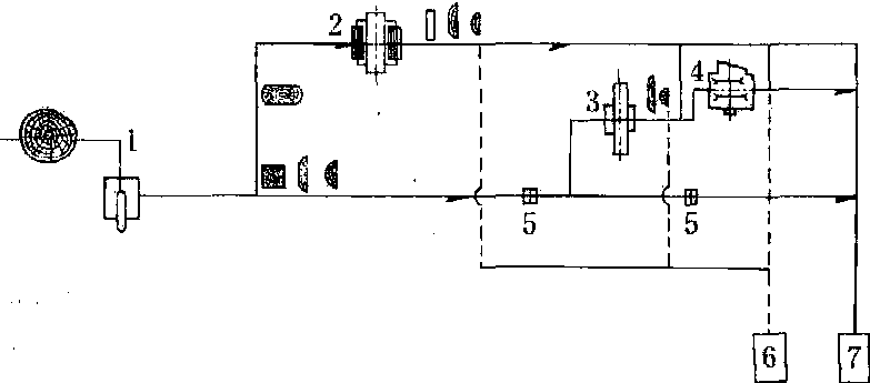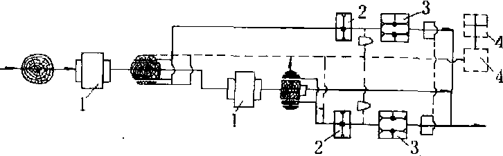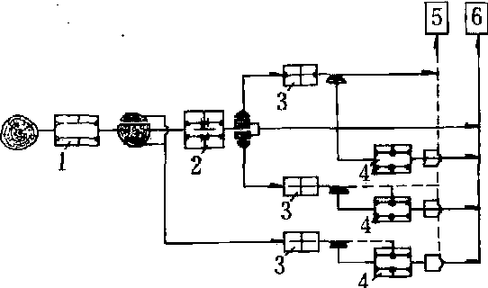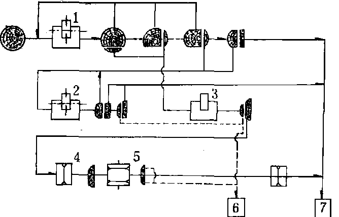 图3 框锯制材工艺程序 1.框锯;2.截断锯;3.裁边锯;4.削片机 以圆锯为主机的制材工艺 由一台或多台单锯片、双锯片或多锯片圆锯机组成。单锯片圆锯机一般锯割小径级原木、缺陷原木及短原木,适用于小规模生产的企业或附属车间。双锯片圆锯机适用于锯割中径级原木,同剖分锯和裁边圆锯组成流水线生产普通锯材。企业内的独立车间大都采用此法。多锯片圆锯机适用于大型制材车间,也适用于小径级原木制材。图4是圆锯制材工艺程序图。原木进料由装有卡爪装置的链式输送机完成。原木锯割之后,板皮由专用装置分开,并送到单锯片薄板锯机进行剖分,锯出的毛边板在双圆锯裁边机上裁边后,运到分选装置加以分选。毛方自动运送到三锯片圆锯机上锯成板材,再运送到分选装置。锯下的板皮仍可进行再加工。