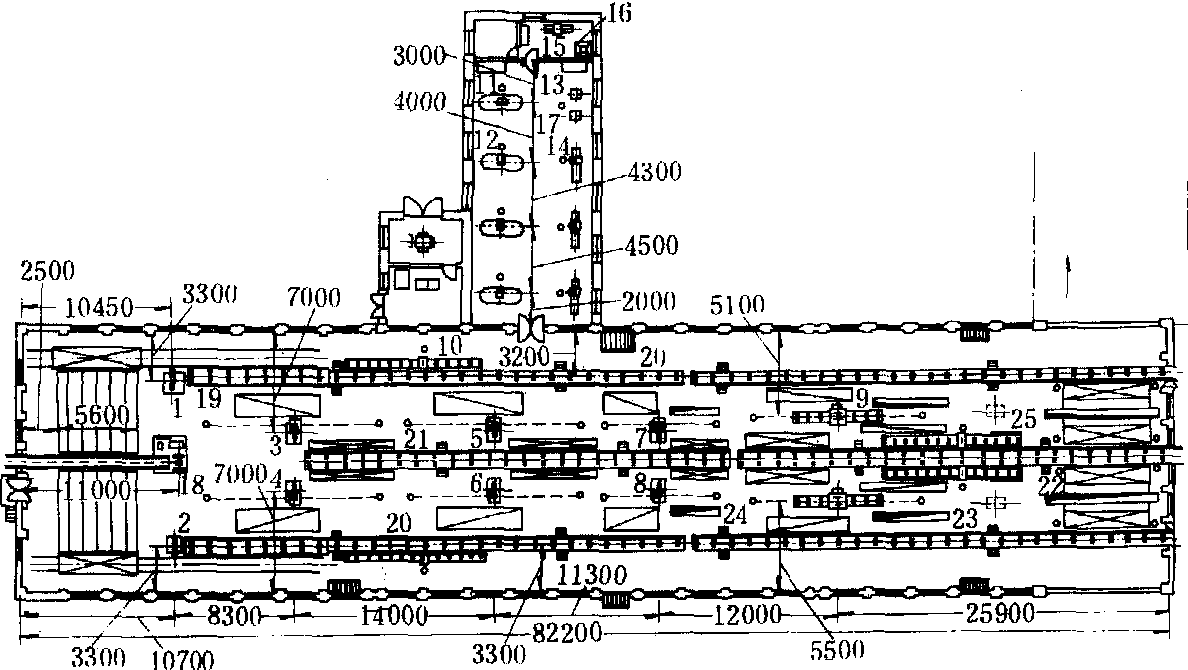 运输设备的选择在制材车间, 各个工艺环节是利用运输设备联系起来的。原木、锯材成品及半成品、板皮和锯屑都应当按照工艺路线和机床的生产性能要求, 按照规定的速度连续或间断地运行, 以保持生产的均衡性与节奏性。制材车间的运输设备包括: ❶原木从楞场进入楞台前的运输设备。其类型的选择是根据生产规模、车间结构、原木特点、原木存放方式等多种因素确定。小平车和抱材车通常在产量较小、运输距离较短的制材车间采用; 原木纵向输送机通常是在产量较大的制材车间,特别是在二层的制材车间采用; 原木横向输送机多与原木纵向运输机配合应用, 也可以代替原木楞台具有贮存原木的功能, 原木不经过转向, 直接把原木送到主锯上; 采用叉车运输原木灵活性强, 特别是锯割大径级原木采用较多。 ❷锯材成品和半成品的纵向运输设备。其类型选择根据生产规模、特点、设备与设备之间联系方式、对机械化程度的要求等因素确定。运输量大、中间环节装卸次数较多的情况下, 应采用辊筒运输机; 运输板材或中间环节装卸次数少及运输板材、小方材时,多采用皮带运输机。 ❸车间内横向运输设备, 多采用圆环焊接链横向运输机。 ❹剩余物的运输设备。根据剩余物的大小及形状特点而采用不同的设备。运输木片, 可采用气力运输装置输送到集中料仓; 小板头、板条则采用皮带运输机; 运输锯屑多采用气力运输机, 也有的采用皮带运输机或刮板运输机。 制材车间工艺布置图 各类锯机、附属设备、运输设备及中间仓库在制材车间的位置图。各种锯机是根据加工程序依次排列的,原料按照加工顺序前进,最后形成半成品和成品。工艺布置图按制材加工特点和产品种类分,有生产不同长度的锯材、毛料、小规格材及木片等复杂产品的工艺布置图;生产较长锯材和木片的工艺布置图;生产专用材的工艺布置图。按照主锯机分,有以带锯为主机工艺布置图;以框锯为主机工艺布置图;以圆锯为主机工艺布置图;铣锯机工艺布置图;铣方机工艺布置图;混合锯机工艺布置图,等等。图1是以带锯为主机的工艺布置图。这种布置,设备为纵向排列,适于锯割不同质量、规格的原木。可采用三面、四面、毛板、径向等下锯法锯割普通锯材、家具材或专用材,工艺灵活性强。