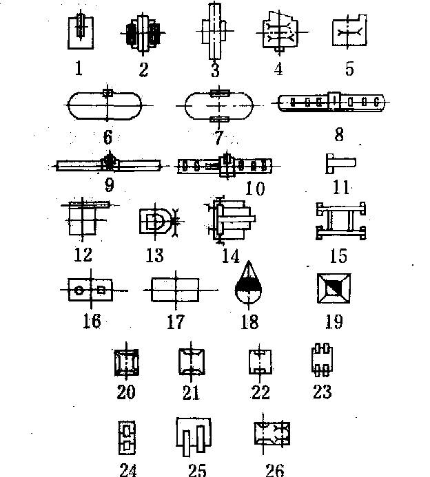 图1 以带锯为主机的工艺布置 设计制材车间工艺布置图时, 应遵循如下原则:❶保证完成生产任务; ❷原木成品、半成品按照工艺过程的顺序流动, 力求直线使流程最短, 避免逆流; ❸合理确定通道及布置工作地, 保证生产安全、操作方便; ❹正确的确定机床之间和机床与墙壁及车间内建筑物、通道之间的距离; ❺合理布置中间仓库的位置和面积; ❻考虑生产发展和必要的灵活性。 图形标记 进行工艺布置时,画出的机床的轮廓图形。其比例一般为1:100,1:200或1:50。机床的轮廓图画出机床的最大尺寸。图2为拟画的机床外形标记,确切大小应根据机床说明书画出。机床旁应标出工人工作位置。