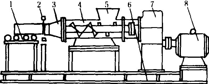 图2 立式挤压水泥土制管机 1.提升机构; 2.主轴;3.锥齿轮;4.压头;5.上压板;6.管模;7.底转盘 波纹塑料管制管机 以聚乙烯或聚氯乙烯为原料,制作直径为50~200毫米、壁厚为0.5~1.1毫米并具有波纹状的管材。全套设备包括挤出机(附有机头与模具)、起波纹机、打孔机及卷绕机组成(图3)。作业时,原料被挤出机加热挤压成薄壁管,并在处于塑化状态时进入起波纹机中。起波纹机配有一对环形链,带着一套连续波纹模,靠一根特别的心杆及利用空气压力,将平滑塑料管压成波纹管。打孔机利用同步机构在波纹塑料管壁打排水孔,孔分为6排,每米长度每排开孔100个,孔眼为1×1~1×1.4毫米。制成的管通过导向装置由卷绕机卷绕成卷。这套设备操作全部自动化,生产速度可以调节,管材可以打孔(用于排水)或不打孔(用于输水管道)。