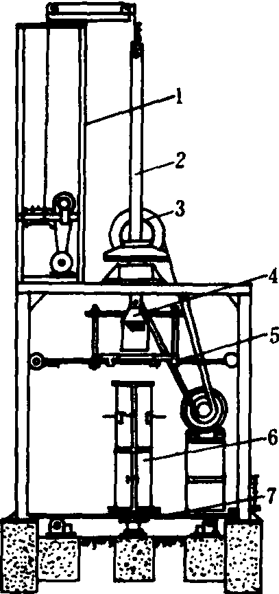 图1 卧式挤压水泥土制管机 1.铺送装置; 2.切割装置;3.机嘴;4.泥缸搅龙;5.喂料口;6.底座;7.变速箱;8.电动机 立式挤压水泥土制管机 其结构如图2。用于制作内径150~300毫米、壁厚20~30毫米、长为1米的水泥土管。作业时,由10千瓦电动机经橡胶带和一对圆锥齿轮,带动主轴及压头旋转(转速为97转/分),压头及其旁侧的压脚在管模中使水泥土压实成管形。压头的外套和其压脚在磨损后可更换。压脚前端斜面与水平面的夹角的大小,对压实物料的干容重和功耗有直接影响,一般取30°~35°;压脚通常用2~3个,其与物料接触面积为管材截面积的1/3。管模是管材成型的模具,为两个半圆柱状的铸铁构件,靠螺栓联为一个整体,当压实成型后拆开管模即得所需管材。这种制管机备有四种不同直径的管模和压头,可制作四种规格的管材;每种管模有3个,在底转盘上可同时放置2个,以保证连续制管。上压板防止管模在作业时左右摆动,保证管材质量。