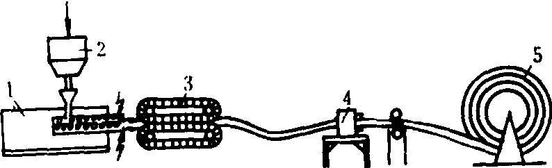 图3 波纹塑料管制管机示意图 1.挤出机;2.原料喂入斗;3.起波纹机; 4.打孔机;5.卷绕机 |