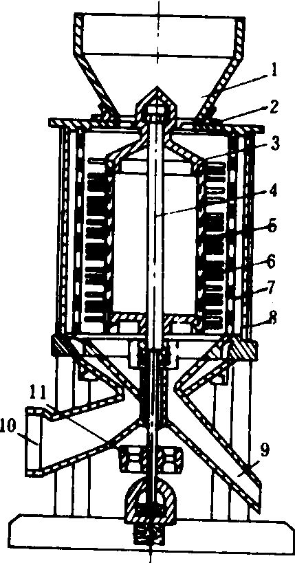 立式刷米机 1.进料斗; 2.进口; 3.散料盘;4.轴; 5.刷米辊; 6.刷子; 7.围筛; 8.外壳; 9.白米出口;10.米糠出口;11.传动轮 卧式刷米机 主要工作部件与立式相似,由刷米辊和筛筒等部分组成。但刷米辊是横卧放置。白米从进料口进入工作区,由于刷米辊的转动(速度为6.5~7米/秒),使米粒与刷米辊和筛筒之间产生摩擦和轻度擦离作用,将米粒表面粘附的糠粉刷下,通过筛筒排出,而刷过的白米从白米出口引出机外。φ500卧式刷米机产量为3 000~4 000千克/小时,配用功率2.8千瓦。 刷米辊的材料,除在组合米机上采用铁辊外,大都使用棕毛、皮革条或橡胶带等柔软材料制成,以减少刷米过程中米粒损伤和碎米。日本还采用氯乙烯树脂刷米辊,借助米粒与刷米辊摩擦时产生的静电进行刷米除糠。 |