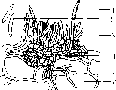 刺盘孢属 1. 刚毛 2. 分生孢子 3. 分生孢子梗 4. 分生孢子盘 5. 菌丝 6. 寄王细胞 |