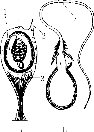 水螅的刺细胞和刺丝囊 a.刺细胞 b. 穿刺刺丝囊的刺丝向外翻出 1. 刺丝囊 2. 刺针 3. 核 4. 刺丝 |