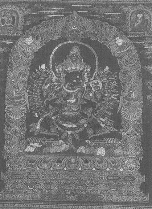 | 释义 | 刺绣大威德怖畏金刚像明。刺绣。纵79厘米,横62厘米。西藏自治区拉萨市布达拉宫藏。此幅唐卡画的是文殊菩萨化身的大威德怖畏金刚像。大威德怖畏金刚是西藏佛教密宗的本尊。密宗教法云:“有伏恶之势,谓之大威,有护善之功,谓之大德,”大威大德故名大威德。有明王中之大威德,有菩萨中之大威德,有迦楼罗王中之大威德。各种大威德,以其性德而名之。此像为玖洛扎瓦的本尊像。金刚站在由吉祥图案组成的基座上,周围是吉祥花卉及小佛组成的拱门。大威德怖畏金刚9头36臂,16足,每只手持一兵器,显示除恶的威慑力量。颈上有蛇逶迤盘绕,腰间用骷髅装饰,形象凶恶可怖。16足下,庇护着飞禽走兽及善良的人类。周围祥云缭绕,左右各有一佛对称于上方。刺绣,是唐卡的又一品种,它是用各色彩缎,剪裁成各种人物和图形,粘贴在织物上,故又称“堆绣”。此画即是用堆绣之法,表现其艺术水平的。