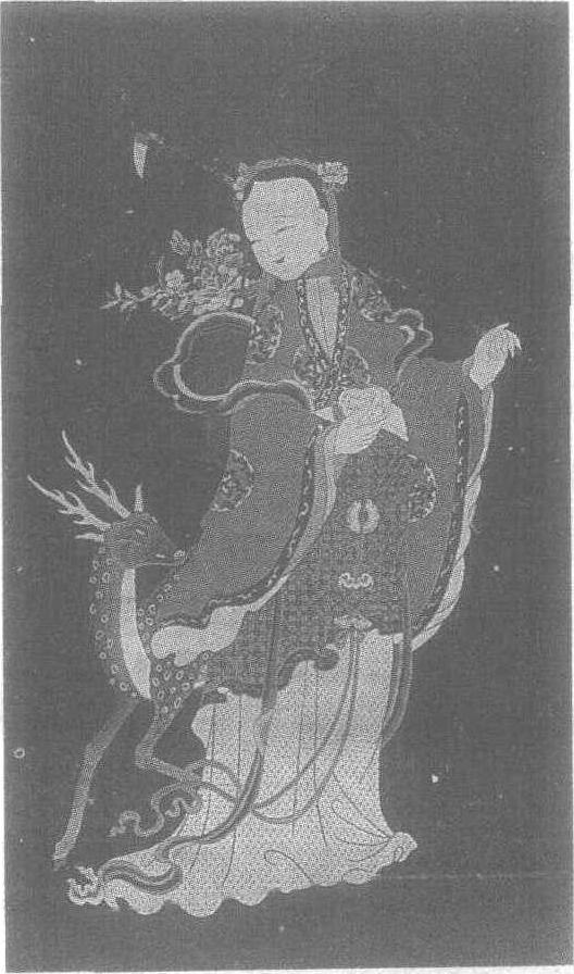 | 释义 | 刺绣麻姑献寿图轴清。纵131厘米,横70厘米。江苏省南通市博物馆藏。麻姑是一位传说中的神话人物,相传东汉桓帝时,仙家王方平乘五龙车召请麻姑。麻姑至,其年十八、九,顶作髻,发垂腰际,锦衣绣裳,光彩夺目,容貌美丽。自云已三见沧海桑田。麻姑下凡,能掷米粒变珍珠,因而轰动一时。传说她会用灵芝酿造仙酒,每年三月三日为西王母祝寿。后麻姑的故事衍变越来越丰富,麻姑成为向年长妇女祝寿的吉祥形象。此幅绣品以深蓝色绸子为地,绣麻姑形象:头梳云髻,面貌端庄,一手捧果盘,上有一仙桃,一肩扛锄头,锄上挑牡丹花篮。身穿朱红色广袖衫,蓝灰色围裙,白色衬裙,披三蓝飘带,腰前系佩。身侧有一只翘首的梅花鹿相随,增强了图的仙境气氛,对人物起了衬托、装饰作用。此绣针法丰富巧妙,主要以“单面”平绣为主,头发用双股捻的“衣线钉”绣线,脸部用不规则的“平套针”,上衣也用“平套针”,飘带用“戏针”,围裙用“压花”,衬裙用“铺针”上加网绣;花篮用“钉线”,蓝脚网绣;梅花鹿用拼色合花线,以“擞和针”绣身躯,“施毛针”绣头部,眼用“滚针”,耳用“缠针”,鹿角用“擞和针”绣成。此绣平整巧妙,是刺绣中的精品。