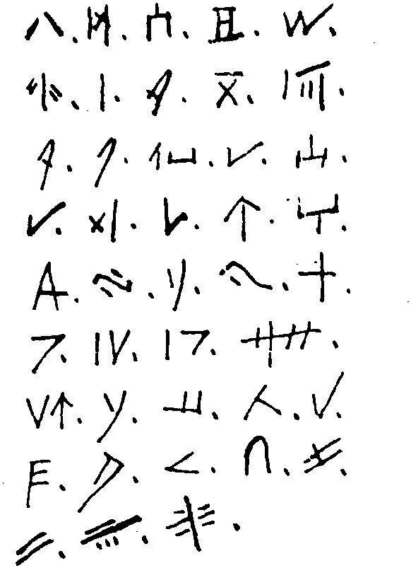 壮族文字萌芽期的刻划符号。最早的刻划文字当首推广西钦州市大寺镇那葛村马敬坡出土的商代石磬上的刻划文:艹、、、、、w、。同一地方出土的一件石上也刻有i、、√等符号。西周时期的类似符号,在武鸣元龙坡出土的石范上刻有艹字。战国初期,这种风格的文字又有发展,武鸣马头安等秧战国初期的陶器上,刻有较为繁复的符号: