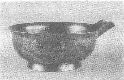 唐。高8.4厘米,口径22厘米。1970年陕西省西安市南郊何家村窖藏出土。陕西省博物馆藏。此器仿铜器器形,有流,亦有圈足。外壁饰折枝牡丹和双鸭衔绶带纹。器内有墨书“廿一两”三字。此器造型较异,纹饰简洁美观,有圈足是其新的特点。
