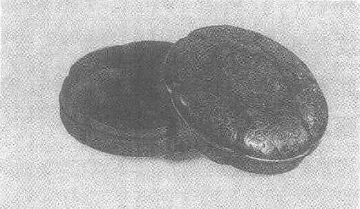 唐。高1.5厘米,口径3.5厘米。1970年陕西省西安市南郊何家村窖藏出土。陕西省博物馆藏。唐代佛教与道教盛行,喜用宝相花作图案装饰。此盒小巧玲珑,纹饰富丽可爱。宝相花是我国传统装饰纹样,它是将自然形态的花朵,特别是荷花,艺术变形后的装饰纹样。