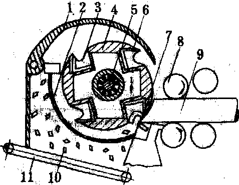 鼓式削片机示意图 进料装置 主要包括料槽和进料机构。通常布置在削片机壳体的后侧,有斜进料和水平进料两种方式。除螺旋面结构和部分斜进料的削片机外,都设有强制式进料装置。进料器有刺辊、人字形辊和齿链等形式。常用机械传动或液力驱动。进料器对木料起压紧和均匀供料作用,使进料速度和切削速度保持稳定,从而提高了木片质量。通常取进料速度为切削速度的1.1倍。料槽端面形状有圆形、方形和多边形。鼓式削片机(见图)的进料槽为方形或长方形,料口包容面积大是其特点;盘式削片机的进料槽为多边形。进料角对木片质量、规格及功率消耗影响极大。在鼓式削片机中,如果是斜料槽(布置在刀鼓中心水平面上方),刀鼓上飞刀与木料顺纹方向的切削角接近90°。切削时随着飞刀所处的位置不同,切削面也不断变化,使飞刀和底刀之间不能形成良好的剪切作用,其切削分力阻碍木料前进,造成切削时木料的跳动,致使碎料增加,木片的长度和厚度不均匀。木料越厚,木片规格差别越大,切削阻力和能耗也急剧加大。改用水平进料后(布置在刀鼓中心水平面下方),尽管相遇角还是在一定范围内变化,但切削分力对木料起着牵引作用,因而木料跳动现象减少,提高了木片质量。在盘式削片机中,斜进料方式常用于切削制材剩余物等短木料,进料槽轴线与刀盘平面的交角为45°~52°,与刀盘纵轴竖直面的交角为10°~30°。水平进料方式常用于切削原木、小径木、板皮、枝桠等木料,进料槽轴线与刀盘平面的交角在36°~42°之间。切削角的减少可以降低功率消耗,但切削角过小会增加长条木片的数量。进料槽的端部安装着底刀、旁刀。鼓式削片机采用四面刃的条形底刀,由于它的飞刀在切削时切削面不断变化,所以飞刀对底刀的间隙不允许调得很小,通常是1~2毫米。在盘式削片机中飞刀形成的切削面是恒定的,飞刀和底刀的间隙可调到0.5~0.7毫米,它采用多面刃的底刀可在机内或机外调整。通常进料槽内还设有安全销和保护罩等安全装置。 切削装置 包括刀盘、刀夹、飞刀、刀轴及联结支承装置。盘式削片机的刀盘通常由优质碳素钢铸造(大型的常用合金钢板组焊),具有一定重量,在切削时起飞轮作用,保证良好的连续切削条件。刀盘上装着飞刀和刀夹,飞刀在刀盘上的位置是依辐射方向前倾8°~15°。飞刀由高速钢、模具钢或高合金钢制成,刃部硬度为RC52~60,心部要求有足够的韧性。飞刀和刀夹用螺柱固定在刀盘上,飞刀伸出量可用齿槽、楔铁或浇铸巴氏合金方法调整。挨着飞刀后部的刀盘上开有刀槽,刀槽的宽度依形成木片的厚度决定,例如木片厚5毫米时,刀槽宽度约为100毫米。削下的木片经刀槽到达刀盘的另一侧,刀槽上还装有抗磨护板。通常,鼓式削片机的刀鼓采用低合金结构钢板焊接而成。挨着飞刀在刀鼓上开设适当宽度的弧形凹槽(或刀夹制成凹槽),切下的木块在这里挤压成片。飞刀及其压板用螺栓固定在刀鼓上,或采用刀架组件在机外换刀调整后装入刀鼓。 排料装置 保证木片及其废料的正常排放。分上、下排料两种方式。主要包括风扇叶片、排料管或网两部分。盘式削片机的叶片有板状、斗状和箱状数种,装在刀盘圆周上或刀盘背面。板状叶片随着刀盘高速旋转,推动木片产生圆周运动;由于叶片推动空气,产生具有一定风速、风压的气流,这样木片沿着机壳切线方向的排料管抛射出去。但这种结构容易打碎木片,增加碎屑量,所以板状叶片逐渐为斗状、箱状叶片所代替。大型盘式削片机由于圆周线速度大,在刀盘上不设叶片,而在排料管上安设风机吹送木片,或采用下排料方式。鼓式削片机通常不在刀辊圆周上安装叶片,采用下排料使木片通过筛网由输送带或气力送走,也可在鼓式削片机的排料管上安设风机,采用上排料方式排放木片。 发展趋势 随着造纸工业、人造板工业的不断发展和原材料的不断变化,各种新型削片机正不断涌现。削片机的结构正朝着提高木片质量,降低能耗,刀具更换调整方便、耐用、安全等方向进行改进。从简化生产工序、提高效率、降低费用的综合性能出发,新型结构的鼓式削片机、双腔或多腔削片机、带抓臂和自装料斗的联合削片机、立木削片机以及剥皮削片联合机等将取代单一的拖挂式削片机,并将在伐区木片生产中获得广泛应用。 |