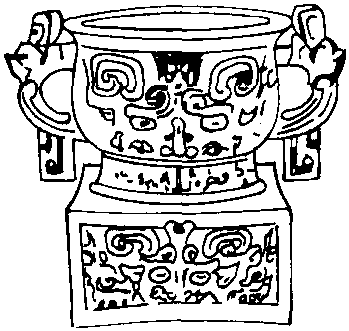 利簋铸于周初,深腹方座,双耳有珥,器腹及方座均饰兽面纹,而以云雷纹为地,夔龙纹相配;方座之平面四角则饰以蝉纹;造型古朴(如图)。器之内底铸有铭文4行,记武王克商之战。