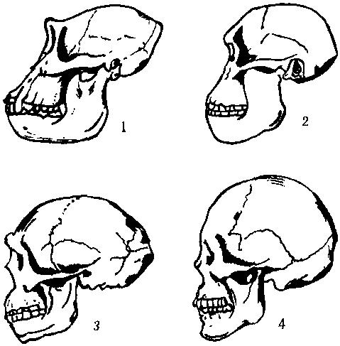 头骨的比较1.雄性大猩猩 2.南猿3.猿人 4.现代人